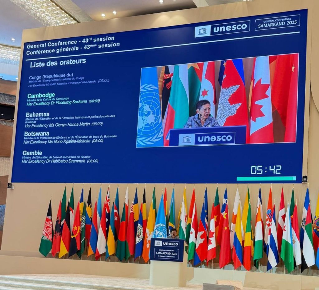 In the afternoon session of the 43rd UNESCO General Conference, H.E. Dr. PHOEURNG Sackona, Minister of Culture and Fine Arts, delivered a speech outlining the policy of the Royal Government of Cambodia. Her Excellency reaffirmed Cambodia’s firm commitment to supporting UNESCO’s mission of building peace through education, culture, science, and communication, in alignment with the Pentagonal Strategy – Phase 1.