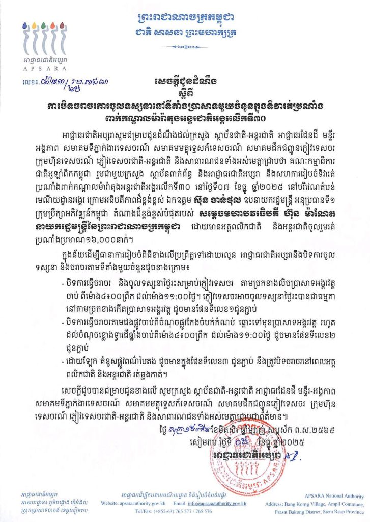 អាជ្ញាធរជាតិអប្សរាបានរៀបចំព្រឹត្តិការណ៍រំលឹកគុណអង្គរលើកទី៥ រយៈពេល៣ថ្ងៃ ចាប់ពីថ្ងៃទី១៤ ដល់ថ្ងៃទី១៦ ខែធ្នូ ឆ្នាំ២០២៥ នៅបរិវេណមុខប្រាសាទអង្គរវត្ត។ ព្រឹត្តិការណ៍នេះ