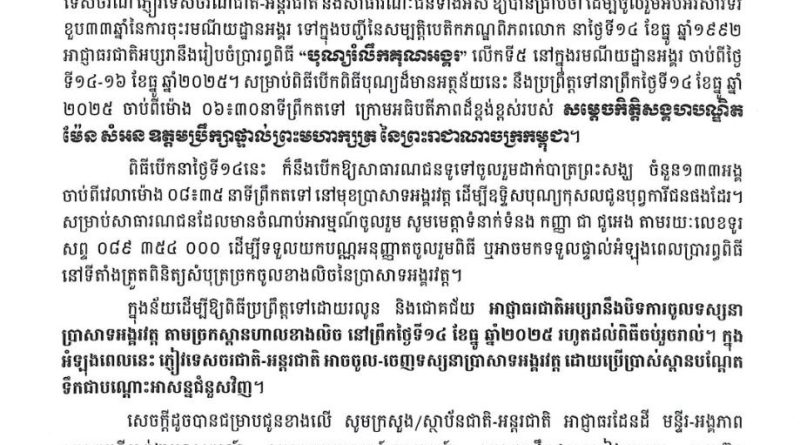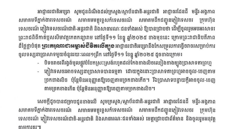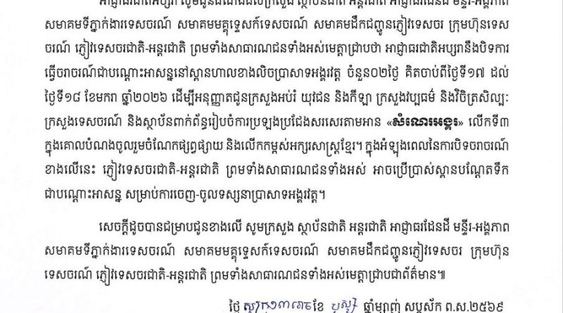 សេចក្តីជូនដំណឹង ស្ដីពីការបិទចរាចរណ៍បណ្តោះអាសន្ននៅស្ពានហាលខាងលិចប្រាសាទអង្គរវត្ត ដើម្បីរៀបចំកម្មវិធី សំណេរអង្គរ លើកទី៣ – 16 January 2026