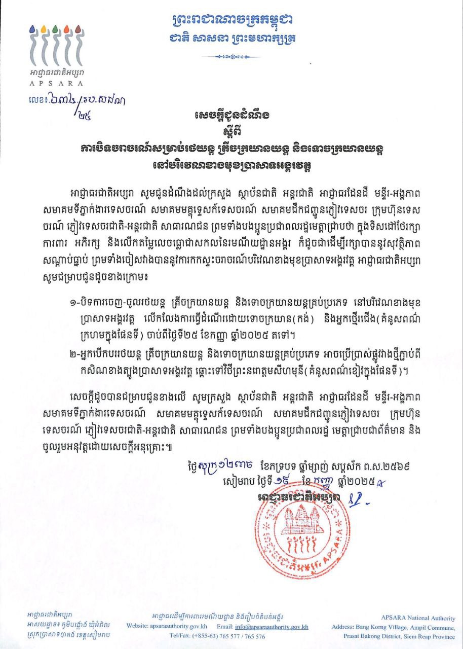 សេចក្តីជូនដំណឹង ស្ដីពីការបិទចរាចរណ៍សម្រាប់រថយន្ត ត្រីចក្រយានយន្ត និងទោចក្រយានយន្ត នៅបរិវេណខាងមុខប្រាសាទអង្គរវត្ត-​ 19 September 2025